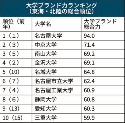 日经BP咨询公司发表了其调查的“大学品牌印象2020-2021”排行结果。其中东海和北陆地区(包括静冈、爱知、岐阜、三重、富山、石川、福井等7县)综合排行榜显示,该地区65所大学综合品牌实力名列首位的是名古屋大学。