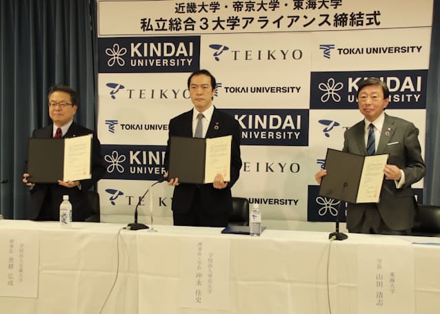 这一合作是由东海大学的呼吁而开展的。东海大学山田清志校长、近畿大学世耕弘成理事長以及帝京大学冲永佳史理事長一起于4月16日在东京都内进行了协议书签字。这三所大学的学生总数共计8万4千人名,山田校长在记者招待会上表示,要像“三根箭”一样开展牢固的合作与联合。同时开展后疫情时代联合体制。