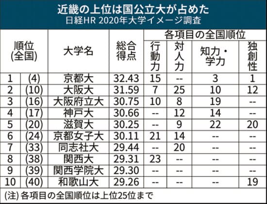 除此之外,以近畿地区著名的“关关同立”而出名的四所私立大学中,同志社大学为第七名,关西大学为第八名,关西学院大学为第九名,立命馆大学为第十二名(该校与前十名失之交臂)。在行动能力与対人力交流能力方面处于位居第十一位的大阪市立大学之后。