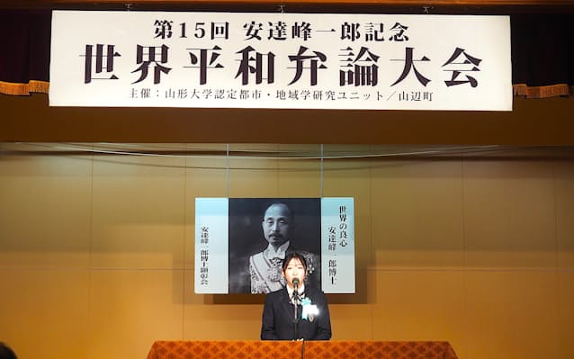 山形大学9日在安达峰一郎出生地山形县山边町举办了以学习为致力于通过国际法解决争端和实现和平的战前外交官安达峰一郎的精神为主题的辩论大会。这是该大会的第15届,有来自县内外的11名中高生上台发言。他们根据自己的经历和调查,提出了为了实现多样性和包容的社会,每个人应该如何思考和行动的建议。