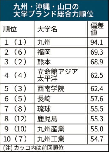该调查是以九州、冲绳以及山口地区55所大学(不包括医科大学和体育类大学)为对象,以“研究设施充实度”以及“学生的交流沟通能力”等与品牌印象有关的49个项目为调查内容,按照偏差值形式算出得分点进行顺序排行得出的品牌力排行榜。