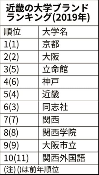 根据日经BP咨询公司发表的“大学品牌力印象调查2019-2020”结果表明,日本近畿主要66所大学当中,综合品牌力连续10年居首位的京都大学今年也稳居排行榜首位。大阪大学也连续11年位居第2位。今年排行第3位的是去年排行第5位的立命馆大学。